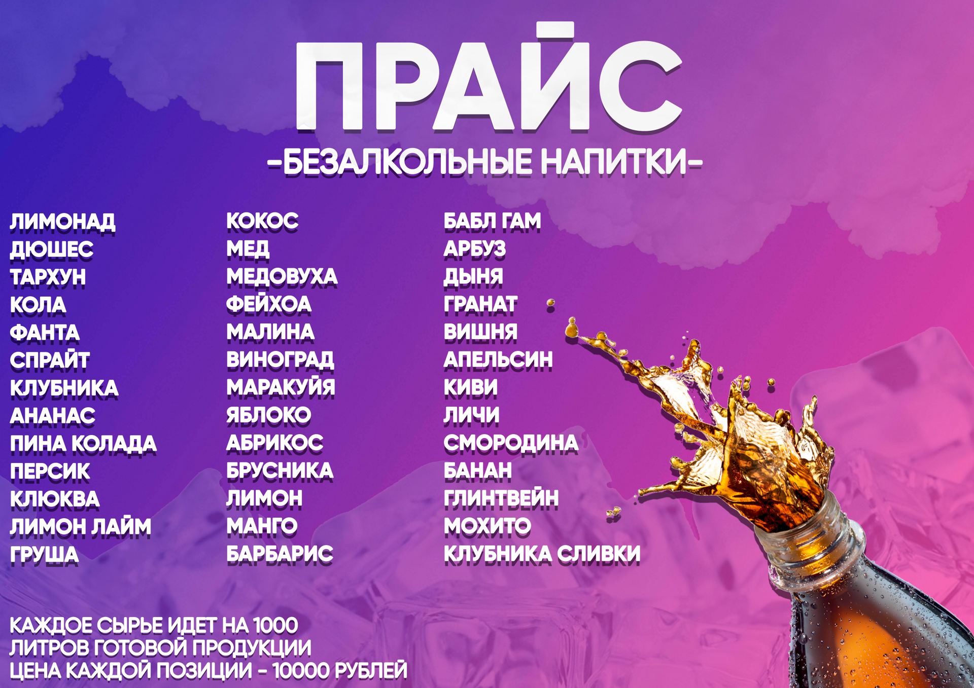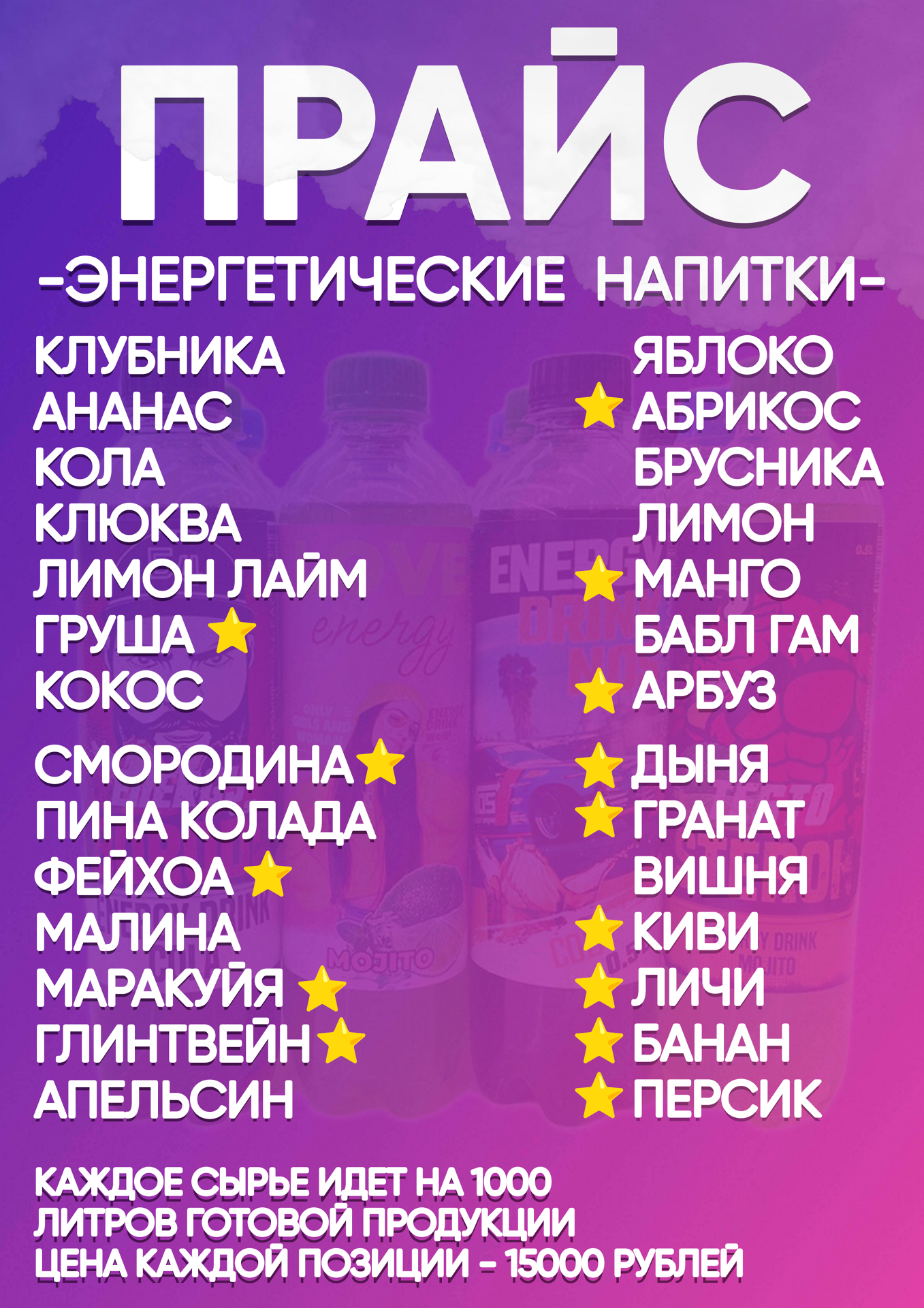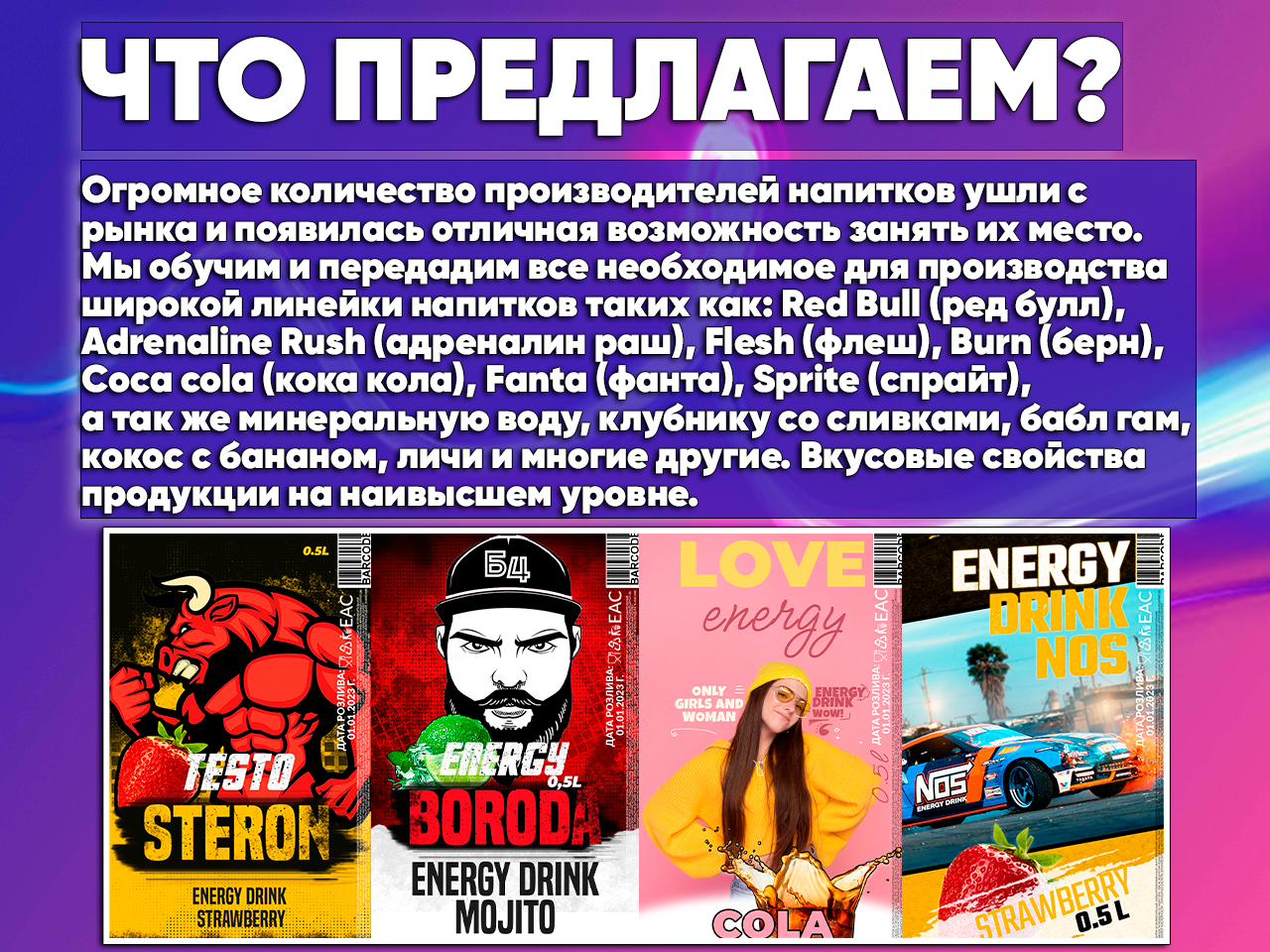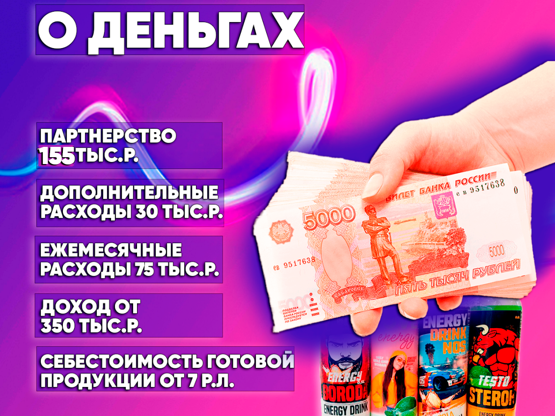 Мы передадим Вам грандиозный накопленный опыт по открытию бизнеса производства напитков в бутылках. Вы сможете ежедневно производить напитки в бутылках с нашим оборудованием. Себестоимость 0,5 литра безалкогольной ЭНЕРГЕТИЧЕСКОЙ продукции 15 рублей, продаются же напитки от 70 рублей за 0,5 литра безалкогольной продукции.